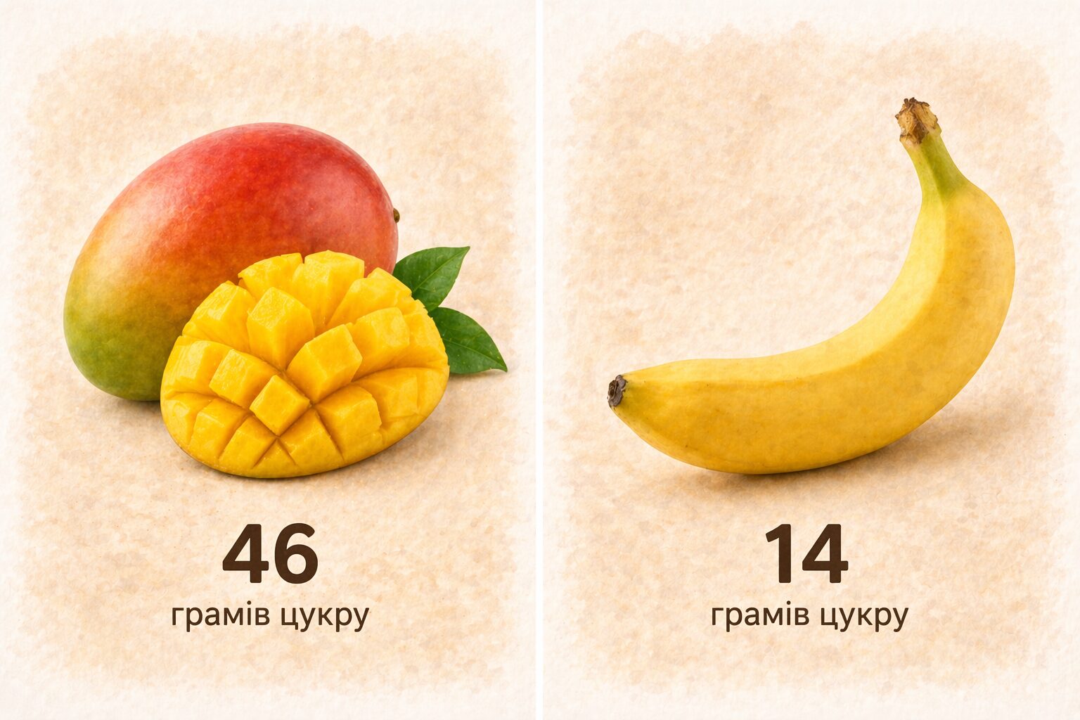 Одне манго дає близько 46 грамів цукру. Тому при контролі ваги чи цукру в раціоні це не найкращий варіант на велику порцію. Краще зʼїсти кілька скибочок, а решту лишити на потім.
